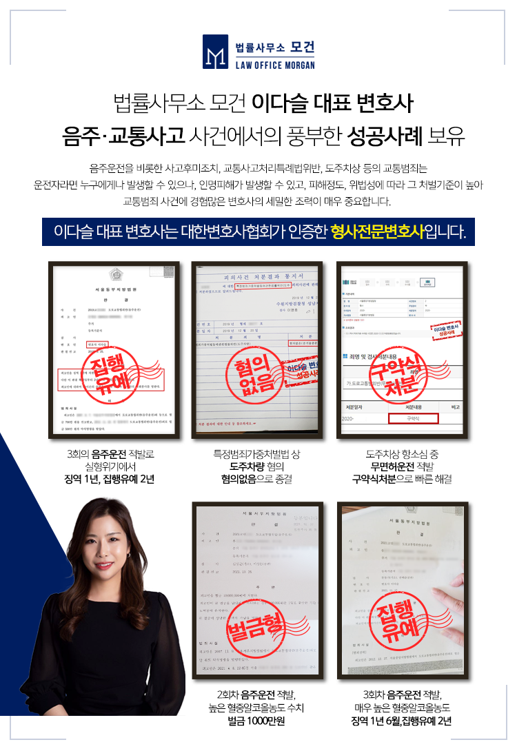 법률사무소 모건의 이다슬 대표 변호사는 대한변호사협회등록 형사전문변호사로서 그간 음주운전 사건에서의 다수의 벌금형, 집행유예의 선처를 이끌어 낸 성공사례를 보유하고 있습니다. 종로, 광화문, 혜화 등 음주운전으로 법률상담이 필요하신 분들은 법률사무소 모건으로 문의하시기 바랍니다.