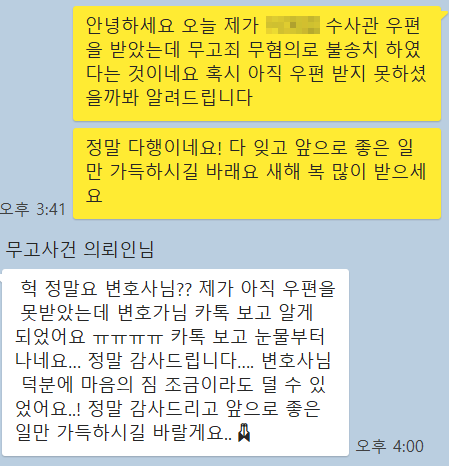 담당 수사관이 제 의견서를 받아 본 시점은 2023. 1. 11. 이었고, 무혐의 불송치 처분을 한 날은 2023. 1. 17. 이었습니다. 담당수사관께서 일주일도 되지 않아 무혐의 처분을 하여주셨습니다. 결과로 인해 그동안 마음고생이 심하셨던 의뢰인님이 안도하시고 기뻐하시는 것을 보면서, 변호사로서 뿌듯함을 많이 느꼈습니다. 앞으로도 의뢰인님이 법적 문제로부터 자유로워질 수 있도록 최선을 다 하겠습니다.