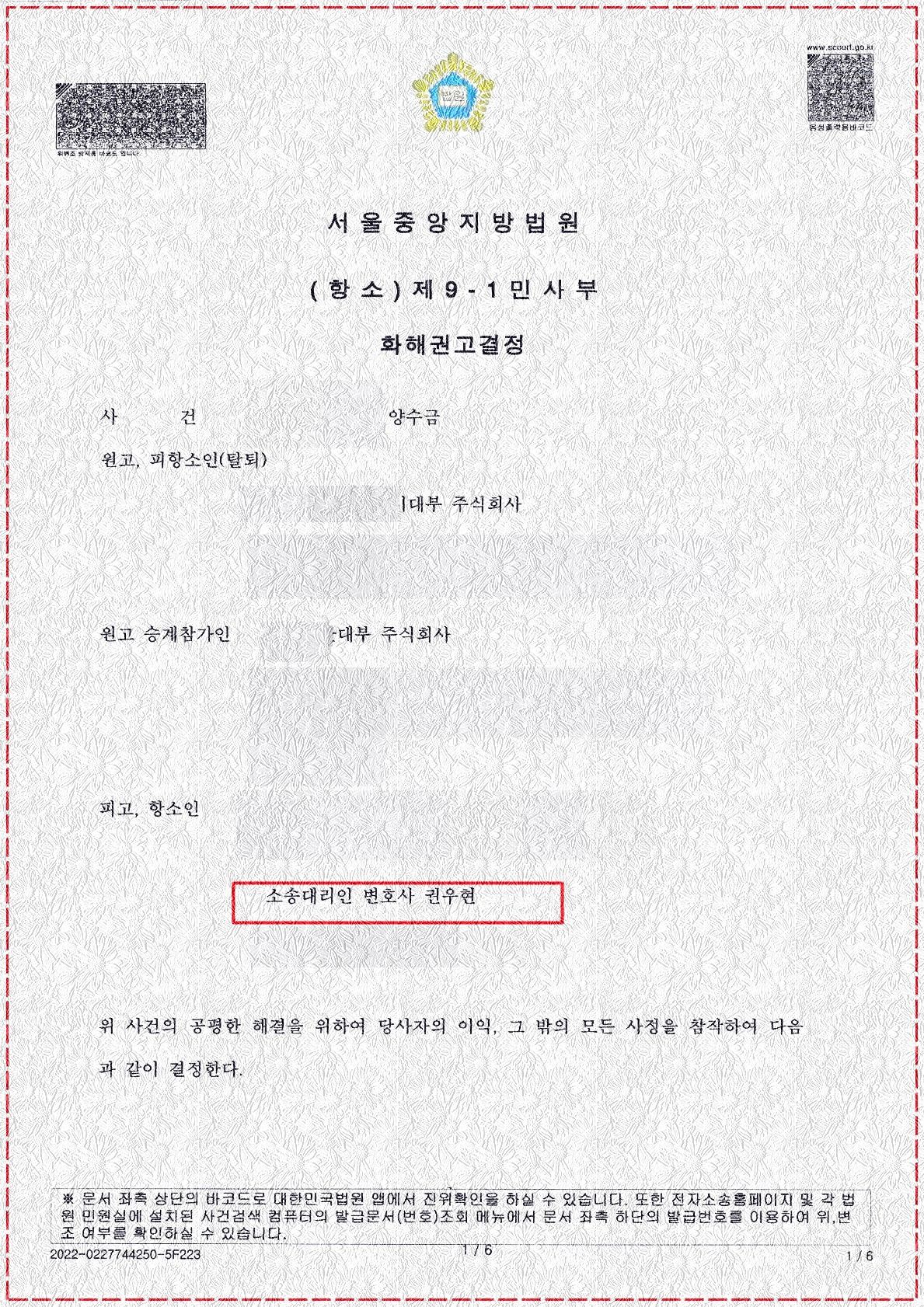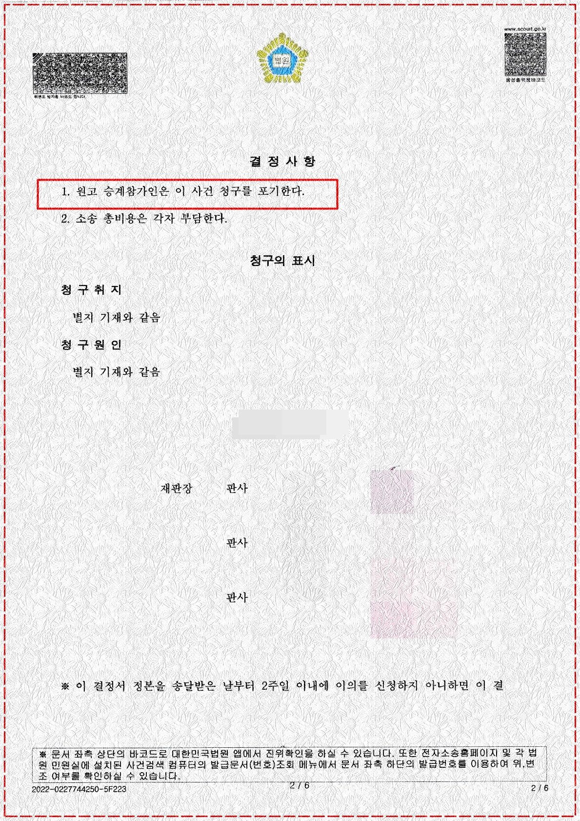 - 추완항소심 재판부는 피고측 주장이 맞다는 판단하에, 참가 원고에게 소송을 포기할 것을 권유하였고, 이러한 내용의 화해권고결정을 참가 원고가 받아들여 확정됨