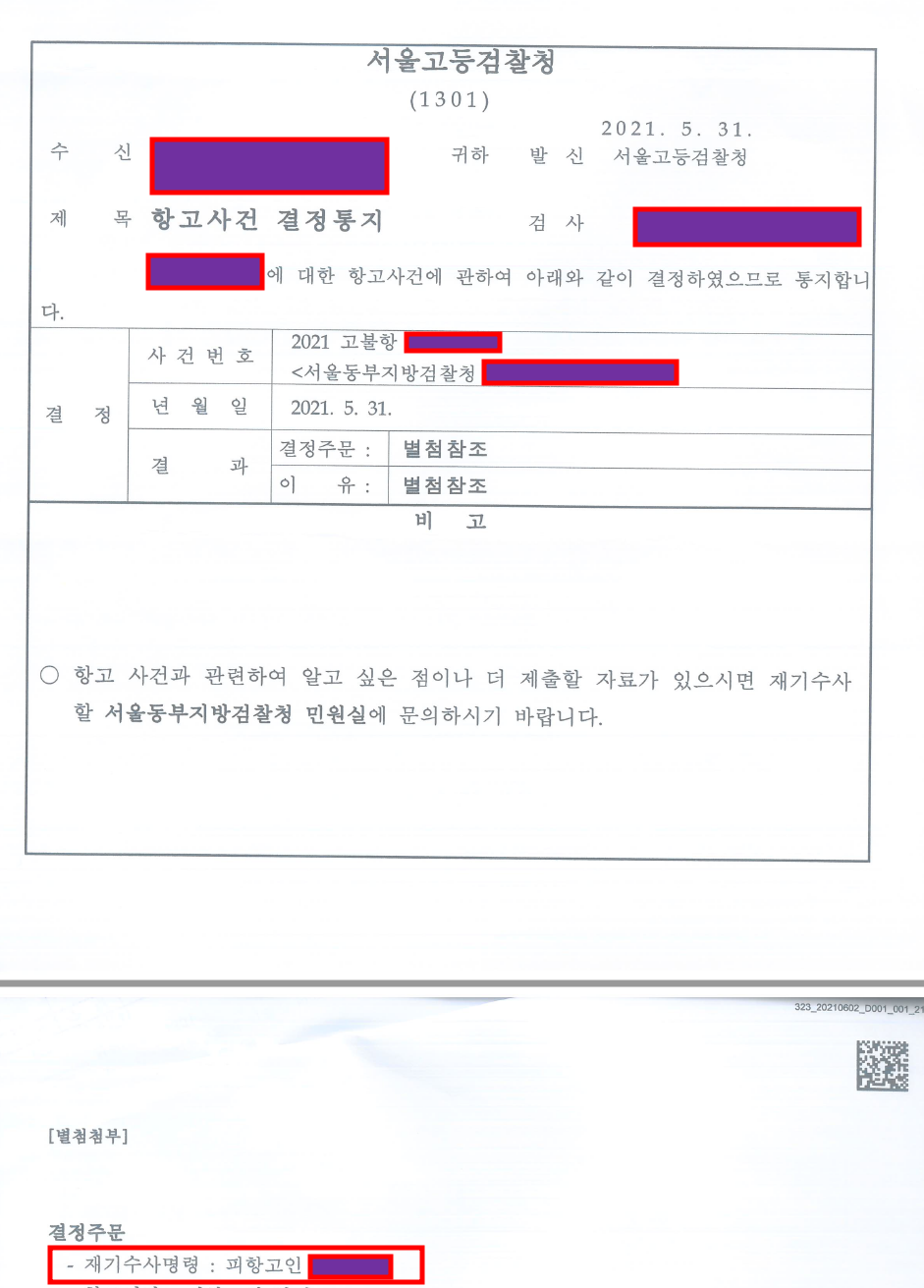 그 결과 고등검찰청으로부터 이 사건 검사의 불기소 처분에 대항 항고 인용 결정(재기수사명령)을 받아낼 수 있었습니다.