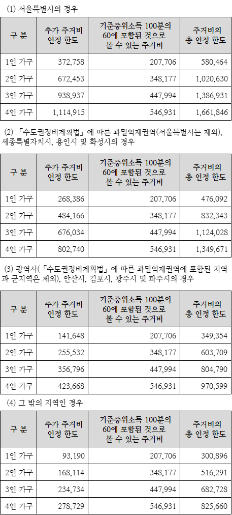 2. 인정범위 : 주거비는 아래의 각 표(단위 : 원) 중 ‘추가 주거비 인정 한도’ 부분에 기재된 금액의 한도 내에서 추가 생계비로 인정 가능함