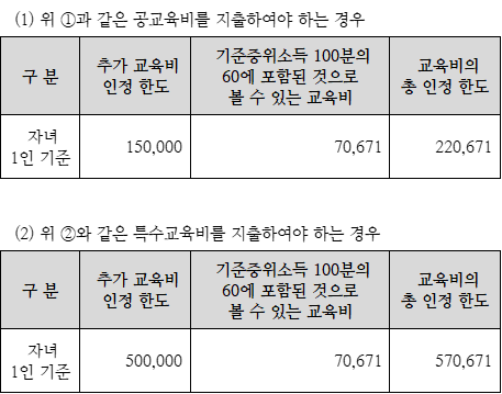 2. 인정범위 : 교육비는 아래의 각 표(단위 : 원) 중 ‘추가 교육비 인정 한도’ 부분에 기재된 금액의 한도 내에서 추가 생계비로 인정 가능함