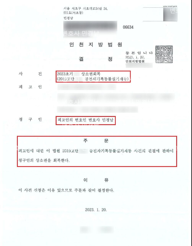 본 변호사의 의뢰인의 경우에도 바쁜 생업으로 인해 1심이 진행되는 줄도 모르고 있었으나 이에 대하여 피고인의 책임질 수 없다는 사유였다는 점을 재판부에 적극적으로 소명하여 상소권회복 결정을 받을 수 있었습니다.