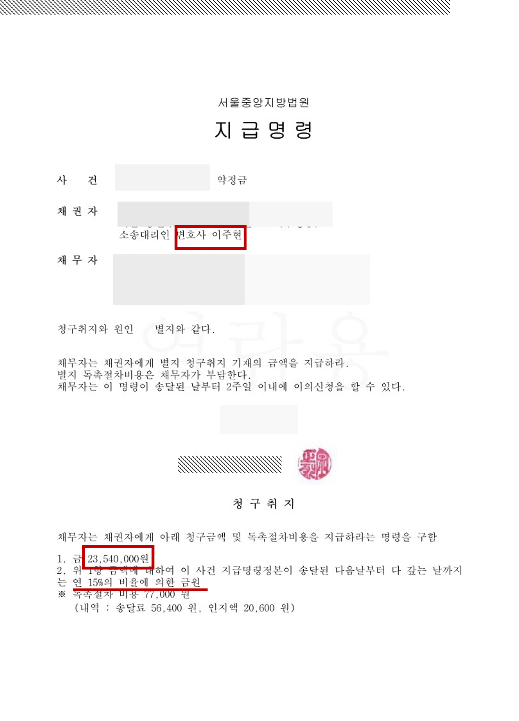 채권추심은 쉽게 말해 못받은 돈을 받을 수 있게 법적인 절차를 거치는 것을 의미합니다. 위 사건의 경우 채권추심을 위해 지급명령의절차를 거쳐 빠르게 수금을 진행하였습니다.