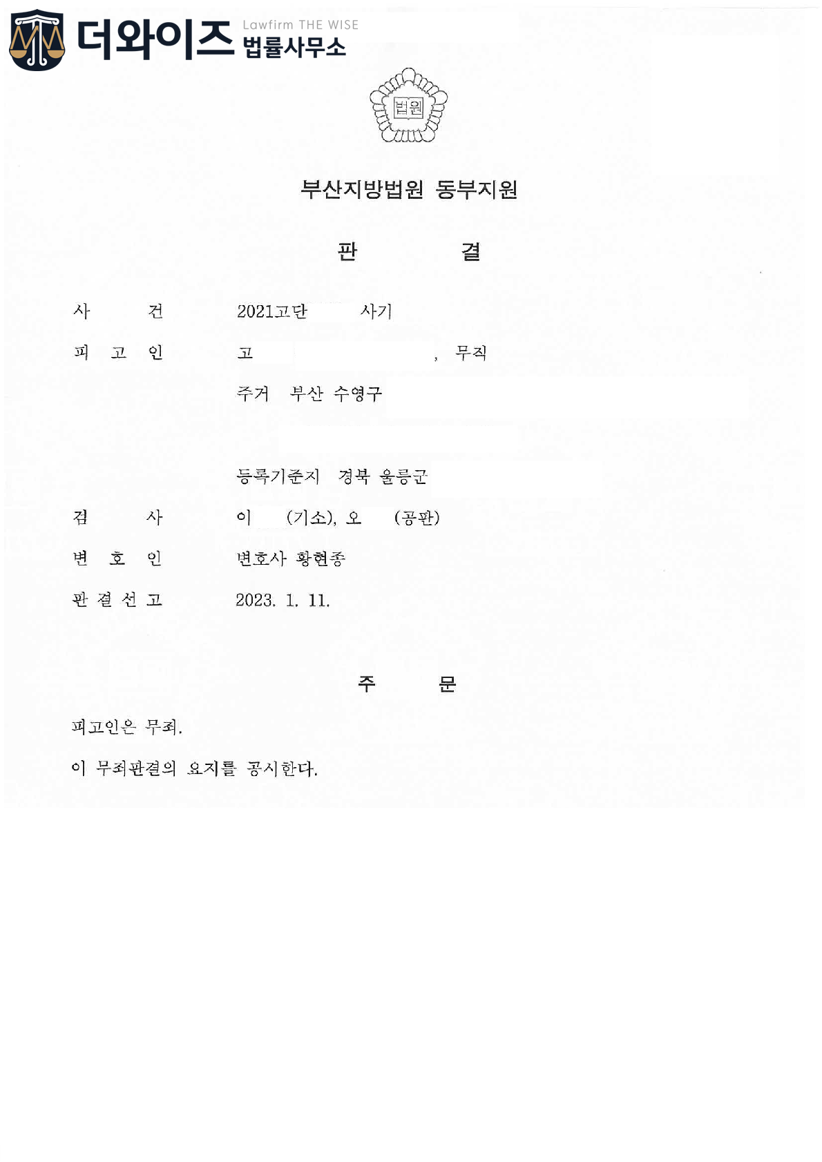 의뢰인은 자칫 잘못하면 억울하게 실형을 선고받을 수 밖에 없는 상황에서 부산사기사건전문 더와이즈 법률사무소 황변호사를 선임하여 위와 같은 형사재판 절차의 진행한 끝에 형사재판에서 1%해당하는 무죄율에도 불구하고 사기사건에 대해 무죄판결을 받아 억울함을 해소할 수 있었습니다.