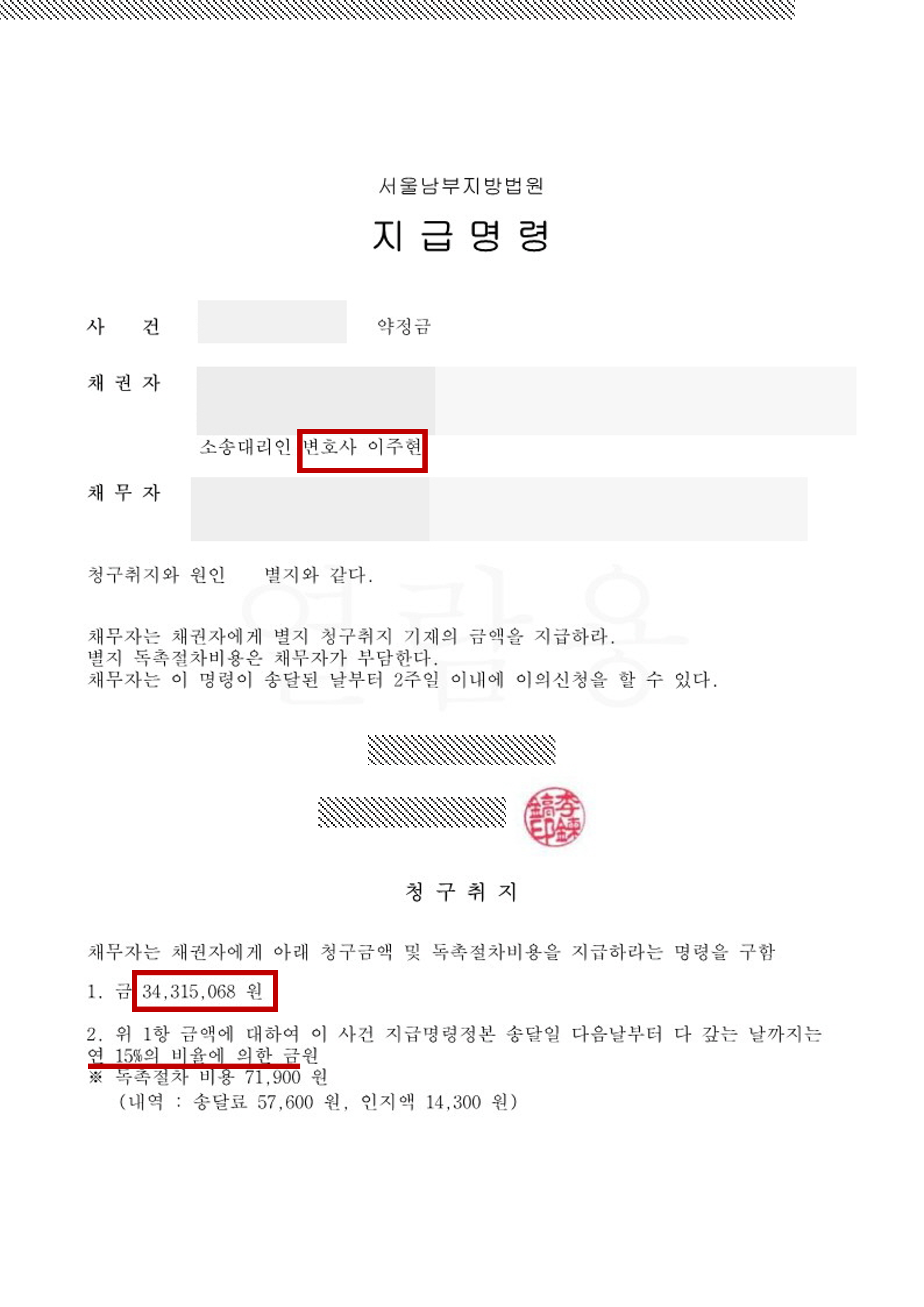 채권자와 채무자 사이의 명확한 계약서 및 이체 내역 등이 존재하였기에 소송보다는 향후 실질적인 추심과 관련하여 임차인의 임대인에 대한 임대차보증금반환채권을 가압류 하였고, 보다 빨리 소송관계를 마무리하고자 지급명령을 신청하였습니다. 예상대로 소송은 빨리 마무리 되었고, 이를 기초로 임대인에게 임대차보증금의 추심을 하였으나, 임대인이 이를 거부하여 결국 임대인에 대한 추심금 소송을 제기하게 되었고, 이와 더불어 해당 건물에 대한 압류를 진행하였으며, 오랜 시간이 걸리기는 하였으나, 결국 만족할 만한 성과를 얻을 수 있었습니다.