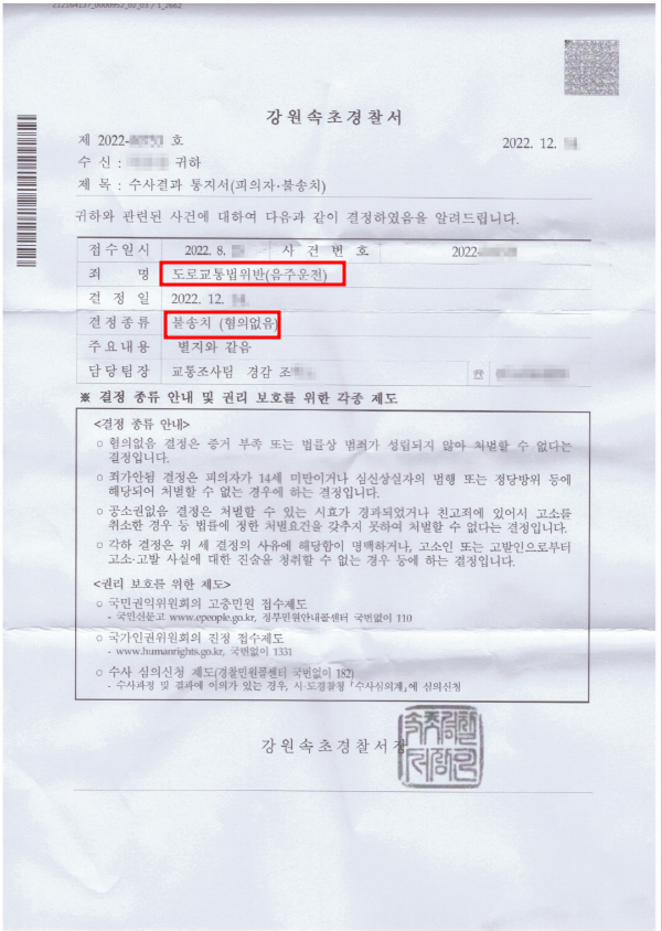 본 변호인의 무혐의 변론에 대하여 수사기관도 심사숙고한 결과, 위드마크공식을 적용하여 의뢰인이 음주운전을 하였다는 부분에 대하여 혐의없음 취지의 불송치 결정을 하였습니다.