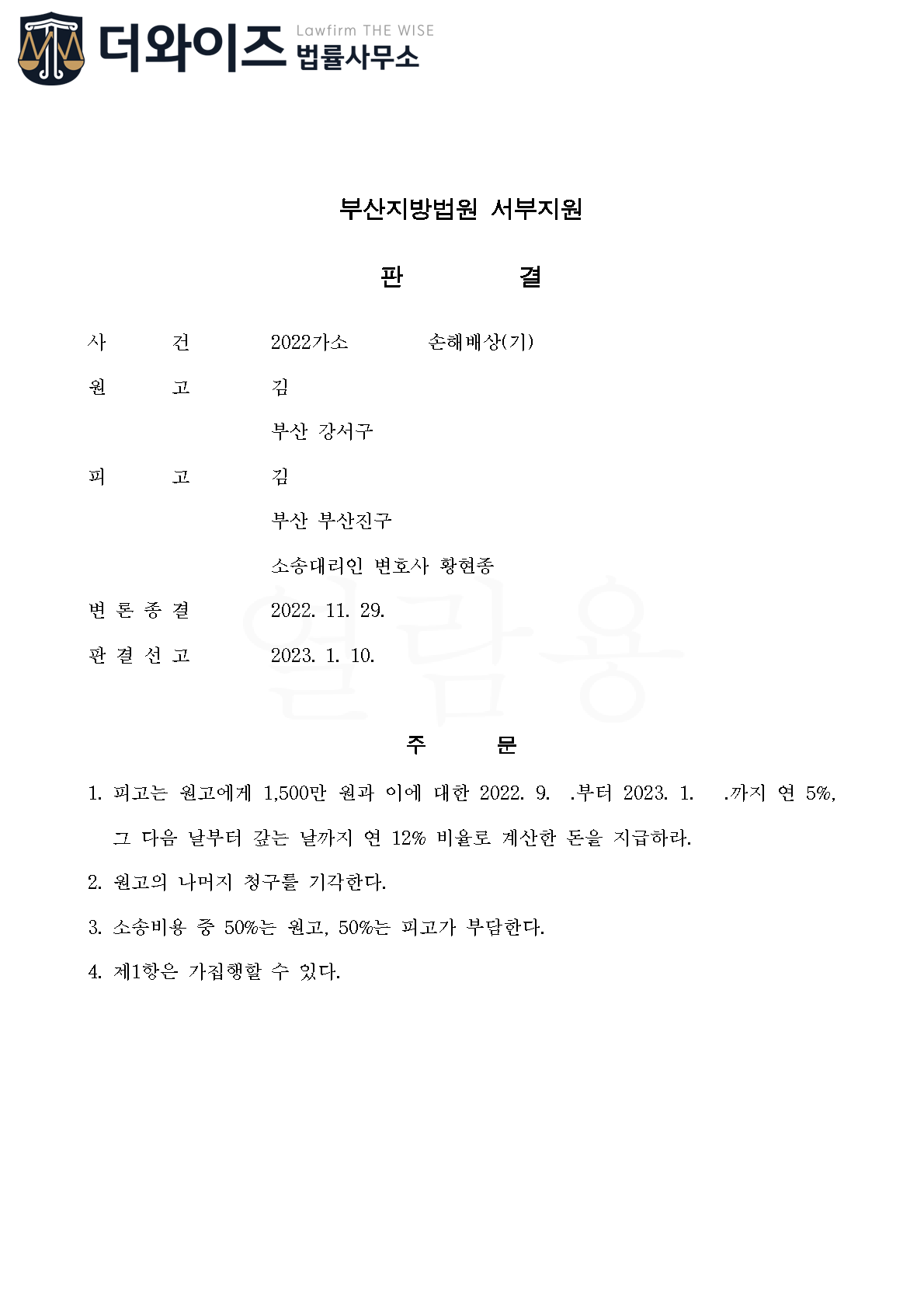 그런데 의뢰인의 상대방은 법률혼이기 때문에 의뢰인은 꼼짝없이 위자료를 배상해야 하는 상황이었습니다. 황변호사는 이와 같은 상황에서 최대한 의뢰인의 사정을 통해 변론하여 소송 중 화해권고결정으로 1,200만원 상당의 위자료로 제한한 결정을 받은 사실이 있으나, 의뢰인이 이를 받아들이지 않아 결국 1,500만원 상당의 판결을 선고받았습니다.