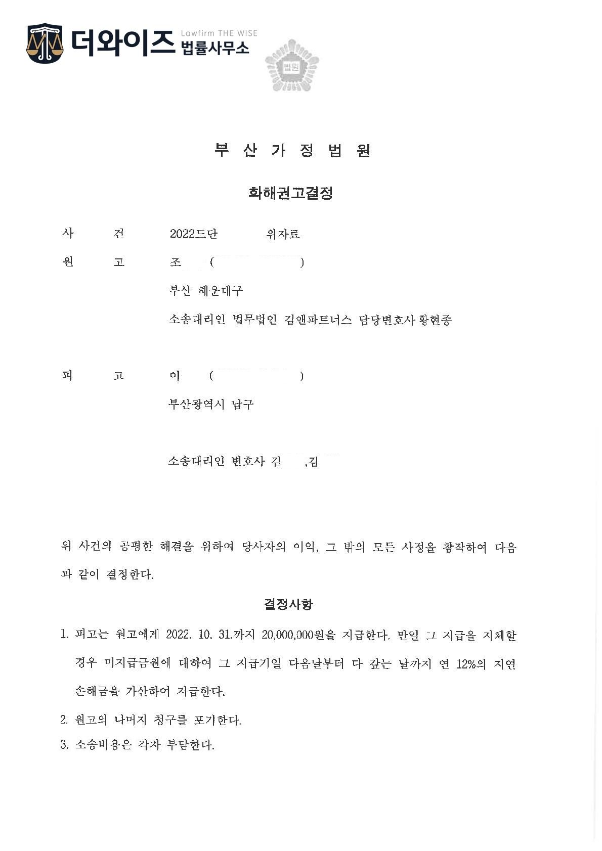또한 상간남의 재산을 파악하여 부동산 가압류 등도 미리 신청하여 진행한 끝에 상대방은 상간 사실을 모두 인정하였고 결국 2,000만원 화해권고 결정을 받게 되었습니다.