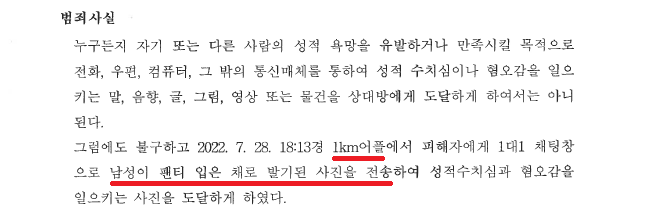 A씨는 2022. 7. 28. 18:13경 평소와 마찬가지로 '1km'를 하던 중 전혀 모르는 여성 B씨에게 다짜고짜 성기 사진을 전송하였습니다. 그러나 B씨는 아무런 대답이 없었고, A씨는 '1km'에서는 흔히 있는 일이라 대수롭지 않게 여겼습니다.