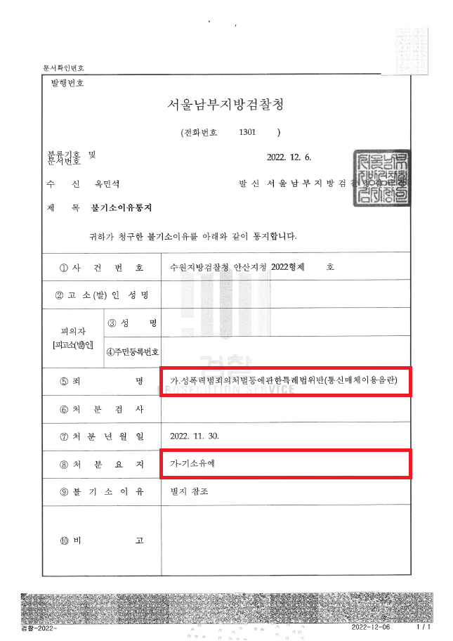 그러나 수사관은 "아무리 '1km'의 분위기가 그렇더라도 성적 채팅이나 사진 전송을 원치 않는 이용자들도 있을 수 있지 않느냐?"라며 사건을 검찰로 송치하였습니다.