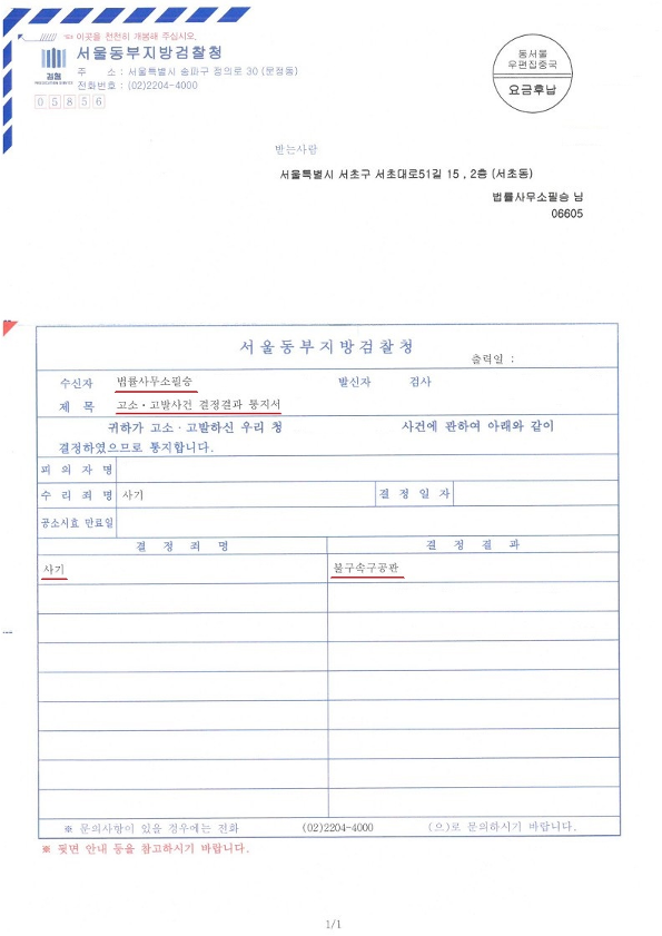 다만 사기죄는 합의가 이루어져도 죄가 인정되면 처벌도 이루어지기 때문에 서울동부지방검찰청은 피의자를 불구속구공판(기소)하였습니다