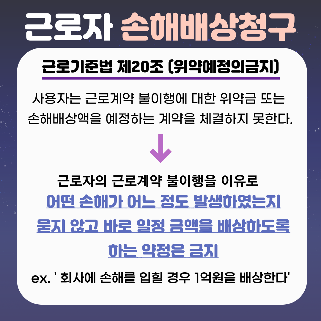 예를 들면, ‘회사에 손해를 입힐 경우 1억원을 배상한다’ 같은 규정을 금지하는 것이죠.