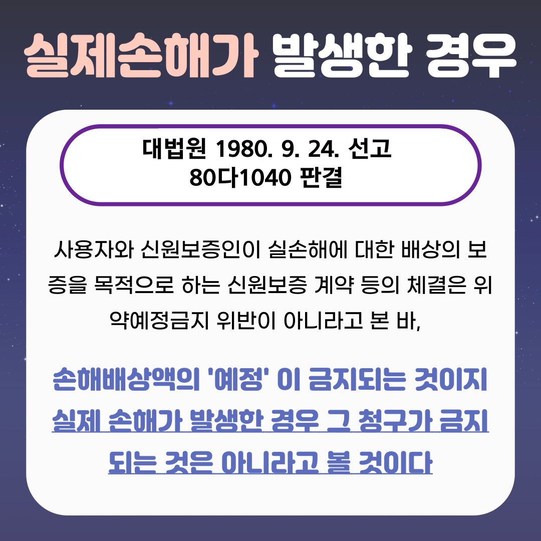 대법원 1980. 9. 24. 선고 80다1040 판결에서는, 해당 규정은 근로자에 대한 손해배상액의 ‘예정’ 이 금지되는 것이지, 실제 손해가 발생한 경우 그 청구가 금지되는 것은 아니라고 판시하였습니다.