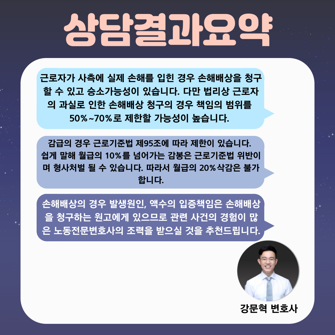 오늘은 근로자 손해배상 및 감봉 상담사례를 소개해 드리겠습니다.