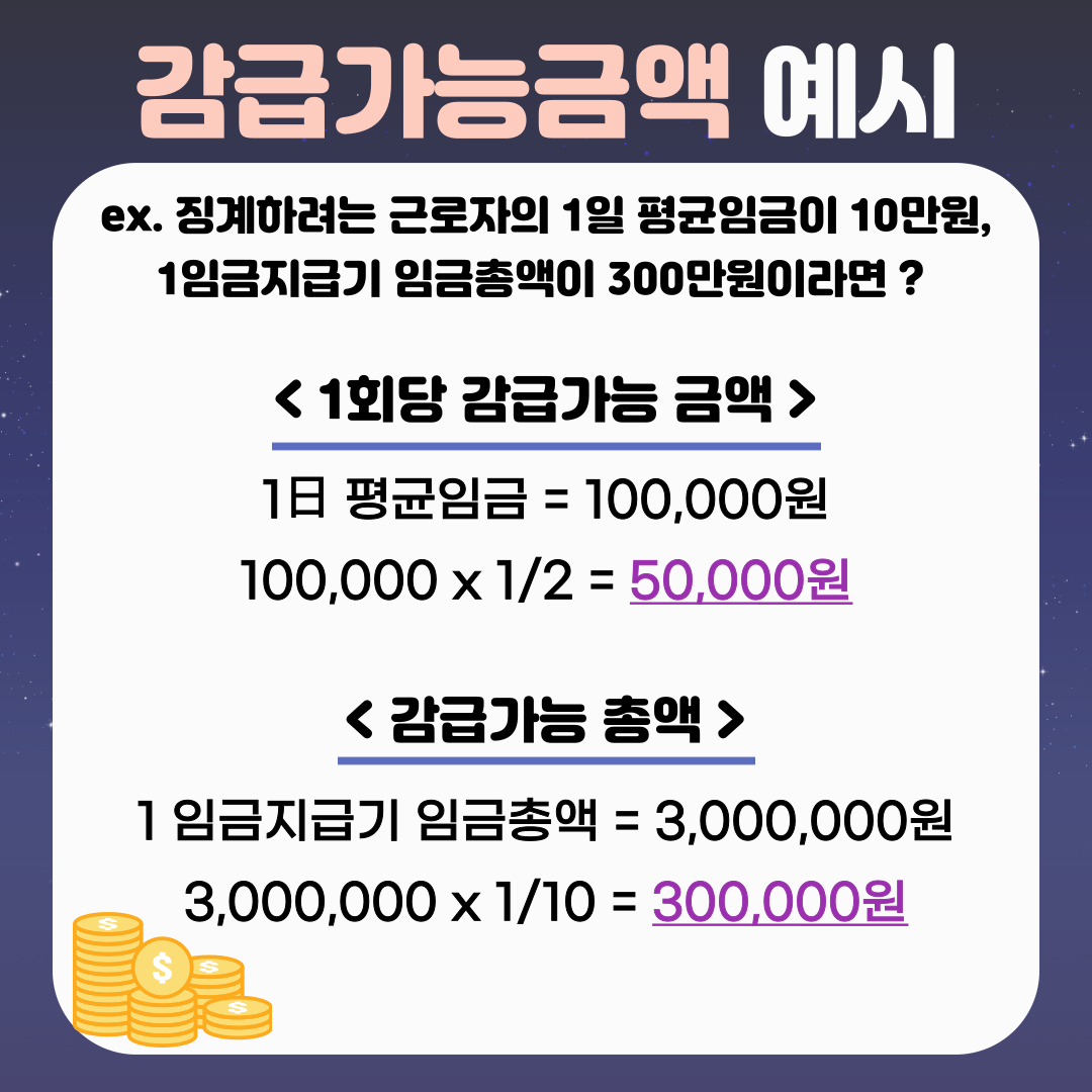 만약, 감봉을 할 정당한 사유 있는 근로자의 1일 평균임금이 10만원이고, 1임급지급기(일반적으로 월급을 받는 근로자의 경우 1임금지급기는 1개월)의 임금총액이 300만원이라고 가정했을 때, 1회당 감봉 가능 금액은 1日 평균임금인 100,000원의 1/2인 50,000원 까지 가능하고, 감봉가능한 총액은 1임금지급기의 임금총액인 3,000,000원의 1/10인 300,000원까지 가능한 것입니다.
