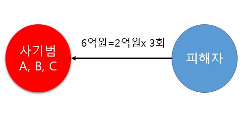 피해자는 3차례에 걸쳐 2억원 씩 총 6억원을 사기범 B, C의 계좌로 입금