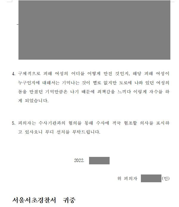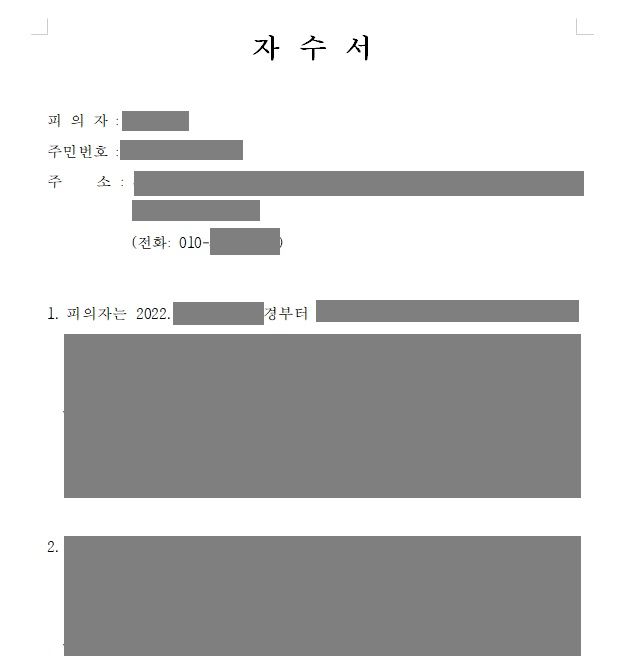 당시 의뢰인 또한 상당히 취해있었기 때문에 여성의 몸을 만졌다는 의뢰인의 기억조차 정확하다고 볼 수는 없지만, 만일 실제로 신고가 이루어져 수사가 개시될 경우 아무리 초범이라 하더라도 징역형에 집행유예까지 가능한 상황이었기 때문에 저는 자수서를 제출하여 양형을 대비하는 한편 경찰의 수사상황을 살펴보았습니다.