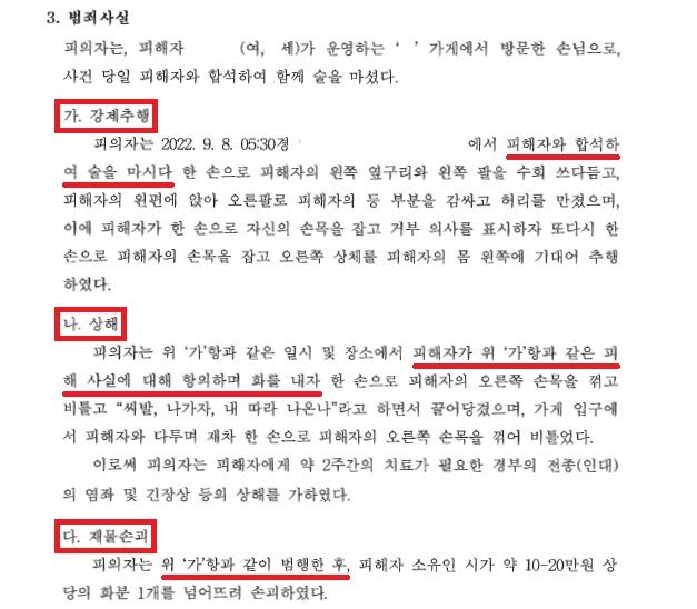 그랬더니 B씨는 화를 내며 "이제 영업이 끝났으니 나가라"라고 하였습니다. A씨는 너무나 화가 난 나머지 B씨의 손목을 잡고 욕을 하며 주점 밖으로 끌고나가려 하였고, B씨와 말다툼을 하며 B씨의 손목을 꺾어 비틀기까지 하였습니다.