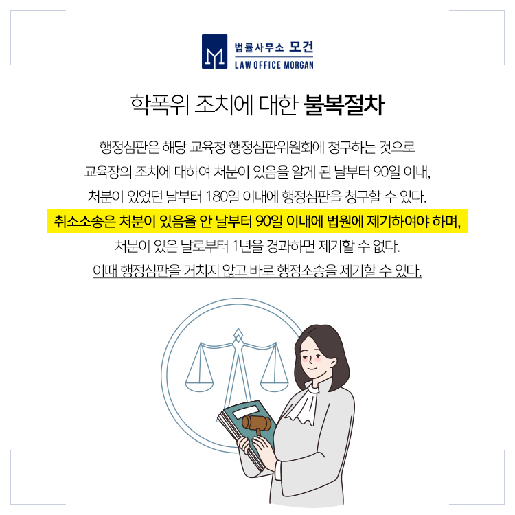 행정심판은 해당 교육청 행정심판위원회에 청구하는 것으로, 처분이 있음을 알게 된 날부터 90일 이내, 처분이 있었던 날부터 180일 이내에 행정심판을 청구할 수 있습니다. 행정심판은 행정소송보다 비용부담이나 시간소요가 적기 때문에 보다 쉽게 접근하실 수 있다는 장점이 있습니다.