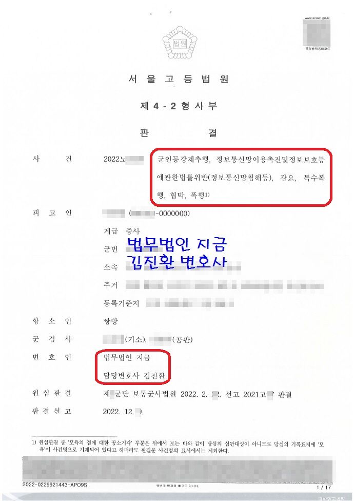 이번에 소개해 드릴 성공사레는 군인등강제추행 등의 혐의로 1심에서 집행유예 판결을 받고 군검찰이 항소를 하여 서울고등법원에서 항소심이 열린 사건인데요