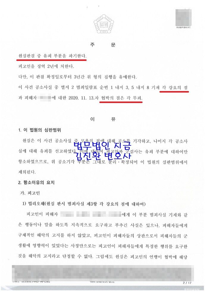 ○ 서울고등법원 판결 : 징역 2년에 집행유예 3년, 일부 강요죄와 협박죄 무죄