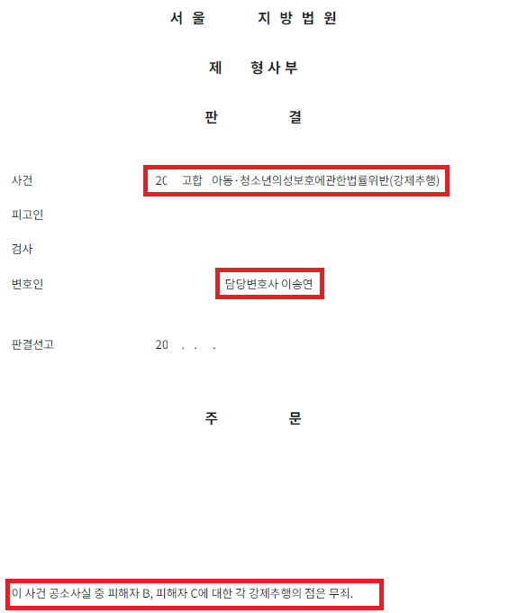 재판부는 본 변호인의 주장을 받아들여 '검사가 제출한 증거만으로는 피고인의 행위가 추행에 해당한다고 보기에 부족하고, 피고인에게 강제추행의 고의가 있었다고 보기에도 부족하다.'라고 판시하며, 고소인 2명에 대해 무죄를 선고하였습니다^^ 굉장히 불리한 상황이었으나 무죄를 받아드릴 수 있어서 무척 기뻤던 사안입니다.