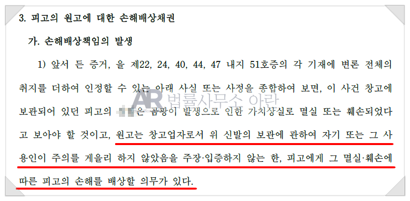 그러나 저는 A회사가 의뢰인을 위하여 물건을 보관함을 영업으로 하고 있으므로 상법상 창고업자에 해당하고, 이 사건 이전에는 의뢰인의 가죽 제품에 한 번도 곰팡이가 발생한 사실이 없으며, B 창고는 다른 창고 와 대비하여 환기 등에 매우 취약한 구조이고, B 창고에 보관 중이던 가죽 제품에서 소수의 곰팡이가 발생해왔음에도 불구하고 A 회사가 이 사실을 의뢰인에게 알리지 않았던 점 등을 들어 A회사가 보관상의 주의의무를 해태하였다는 사실을 강하게 피력하였습니다.