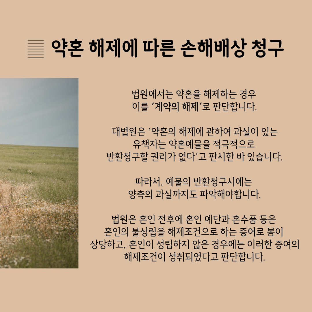 오늘은 상대방과 약혼한 상태에서 약혼을 파기하고자 하는 의뢰인이, 그 약혼해제에 따른 손해배상을 청구한 사건에 대해 말씀드리겠습니다. 연인이 단순히 이별하는 것과, 결혼을 상당한 수준까지 준비하던 중 이별하는 것은 차원이 다른 일인데요. 양가의 부모님부터 시작해서 신경 써야 할 사람도 많지만, 혼인을 준비하는 단계였다면 가전 구입비용이라든가 예물구입비용, 그밖에 웨딩 촬영이나 신혼집 마련 비용 등 모든 비용 부분이 쟁점이 될 수 있습니다.
