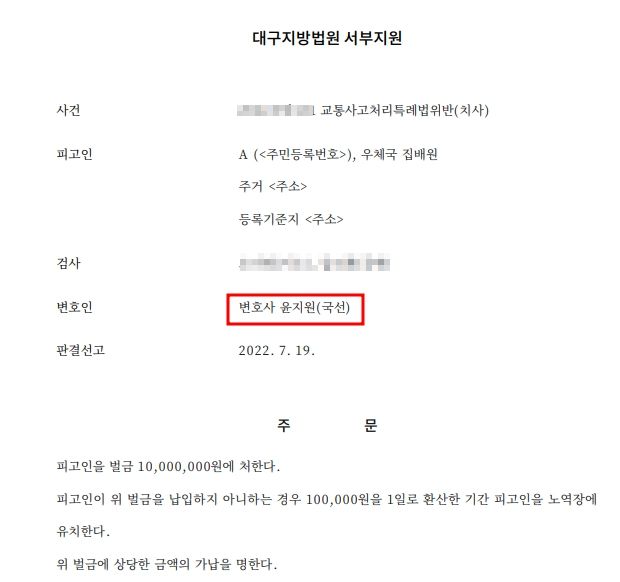 피고인이 만약 금고 이상의 집행 유예나 선고유예를 받을 경우 피고인의 의사에 반하여 근로계약을 해지당할 수 있는 상황이었습니다. 변호인은 피고인의 근로계약이 해지당하지 않도록 피고인의 가족 및 직장동료들의 탄원서, 피해자와의 합의서를 제출하였습니다. 변호인은 피고인이 교통법규 위반으로 단속된 경우가 1회에 불과할 정도로 교통법규 위반을 준수하는 운전자였다는 점, 피고인의 사고 후 대처상황, 기타 피고인에게 유리한 정상을 기재한 변호인 의견서를 제출하였습니다.