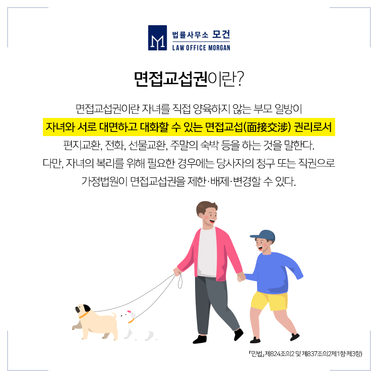 부모와 자녀의 친밀한 관계는 부모가 혼인 중일 때뿐만 아니라 부모의 이혼 등으로 자녀가 부모 중 일방의 양육 아래 놓인 경우에도 지속될 수 있도록 보호할 필요가 있는데요. 이혼 후 비양육자와 자녀와의 면접교섭권은 이를 뒷받침하여 자녀의 정서안정과 원만한 인격발달을 이룰 수 있도록 하고 이를 통해 자녀의 복리를 실현하는 것을 목적으로 하는 제도입니다.
