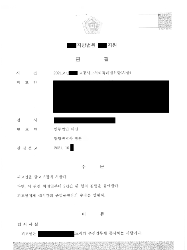 금고 6월, 집행유예 2년, 40시간 준법운전강의 수강