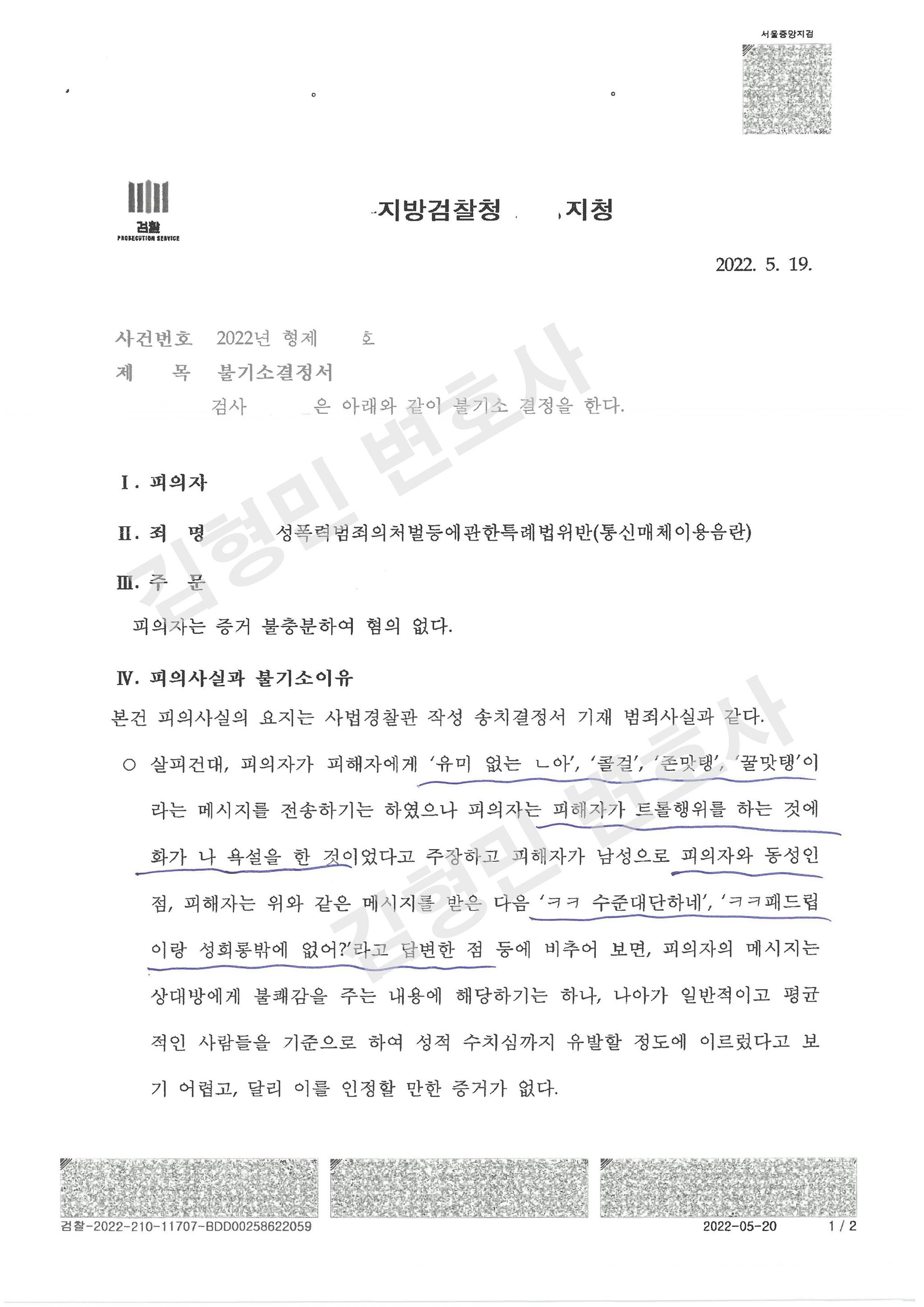 20. 통매음 통신매체이용음란죄 혐의없음 불기소처분