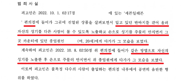 사범대학생 A씨는 1주일 단위로 새벽마다 총 2차례에 걸쳐 자취집 근처 ○○편의점에 들어가 성기를 반바지 사이로 노출하여 주물러 만지면서 아르바이트생 여성 B씨에게 다가갔습니다.