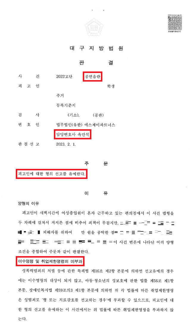 이러한 저의 조력을 바탕으로 A씨는 B씨와 합의하지 못하였음에도 불구하고 선고유예를 받음으로써 2년이 경과하면 면소된 것으로 간주되어 어떠한 전과기록도 남지 않게 될 뿐만 아니라 이수명령 및 취업제한명령도 피할 수 있게 되었습니다.