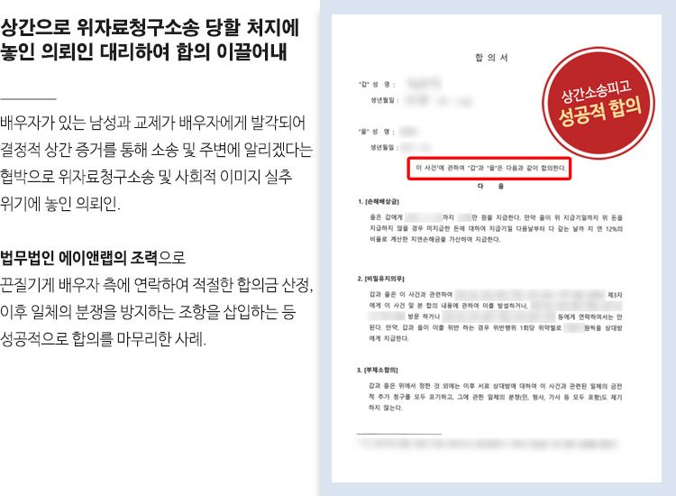 에이앤랩의 조력으로 의뢰인을 대리 및 성공적인 합의를 마칠 수 있었고, 의뢰인은 소송까지 가지 않고 신속하게 사안을 마무리함으로써 시간 및 금전적 소비를 최소화하고, 주변인들에게 상간녀라는 이미지 실추를 막을 수 있었습니다.