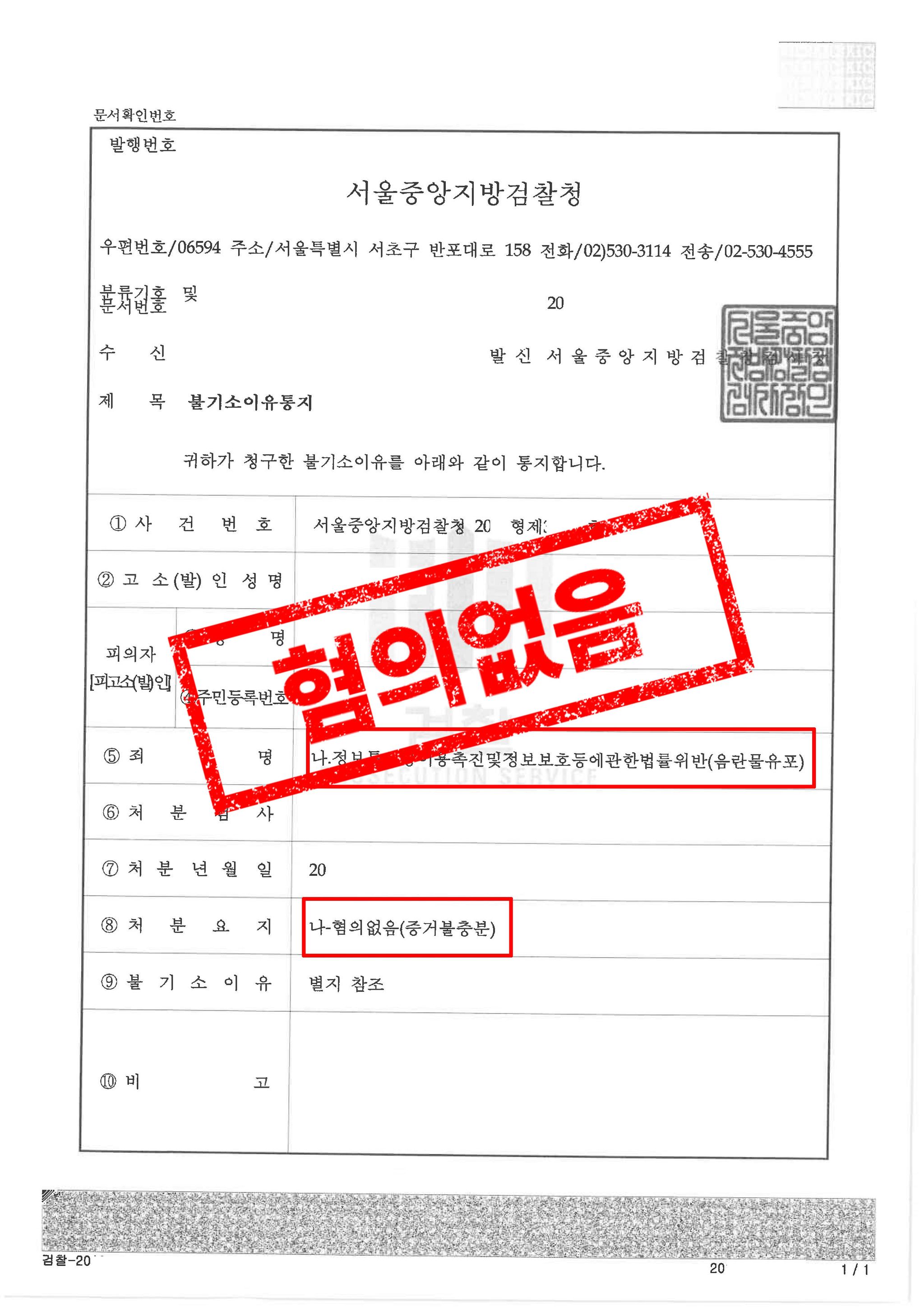 수사기관도 본 변호인의 변론주장과 변호인 의견서 및 관련 증거들을 참고한 뒤, 사건을 면밀히 검토하여 혐의없음 처분을 하였습니다.
