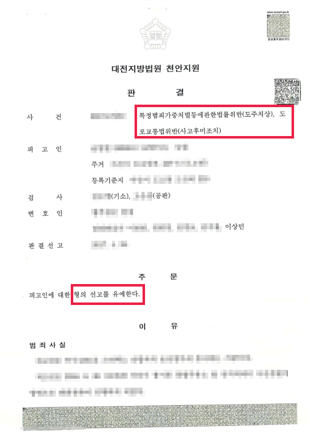 이에 재판부는 의뢰인이 교통사고가 발생한 후 적절한 조치를 취하지 못할 수 밖에 없었다는 점을 정상참작하여 의뢰인에게 선고유예 판결을 내렸습니다.