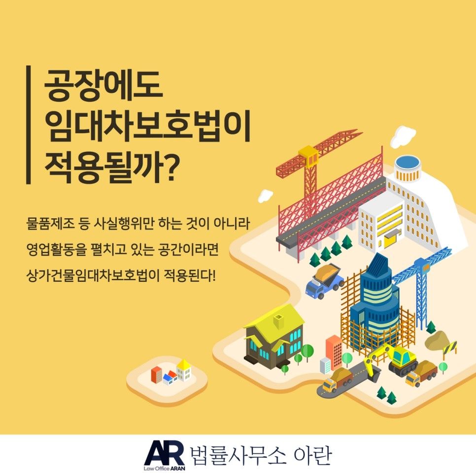대개 공장의 경우, 상가가 아니라고 생각하여 상가건물임대차보호법을 염두에 두지 못하시는 경우가 많습니다. 그러나 공장이라 하더라도 해당 공장 외에 별개의 영업소를 두지 않고 있어 그 공장에서 제조행위부터 영업활동까지 모두 다 이루어지는 경우라면 상가건물임대차보호법 적용이 가능합니다. 그러므로 공장 임대차를 둘러싼 다툼이 있을 때에는 공장 임대차 사건을 다뤄본 전문 변호사와 상담하시는 것이 좋습니다.