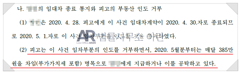 한편 의뢰인은 이 사건 임대차계약의 갱신을 원하는 입장이었으므로 계속해서 원고에게 월세를 지급하고 있었습니다. 그런데 소송이 한창 계속되던 중, 원고는 의뢰인으로부터 월세를 지급받던 계좌를 폐쇄하고 의뢰인에게 새로운 계좌를 알려주지 않았습니다.