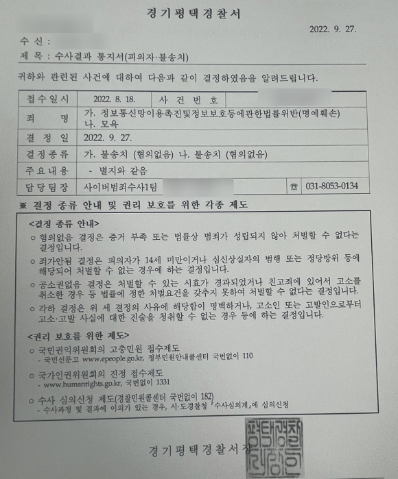 의견서를 제출하고 경찰단계에서 바로 역시나 저희가 예상한 대로 의뢰인분은 명예훼손과 모욕죄 혐의에 대해 모두 무혐의 통지를 받게 되셨습니다.