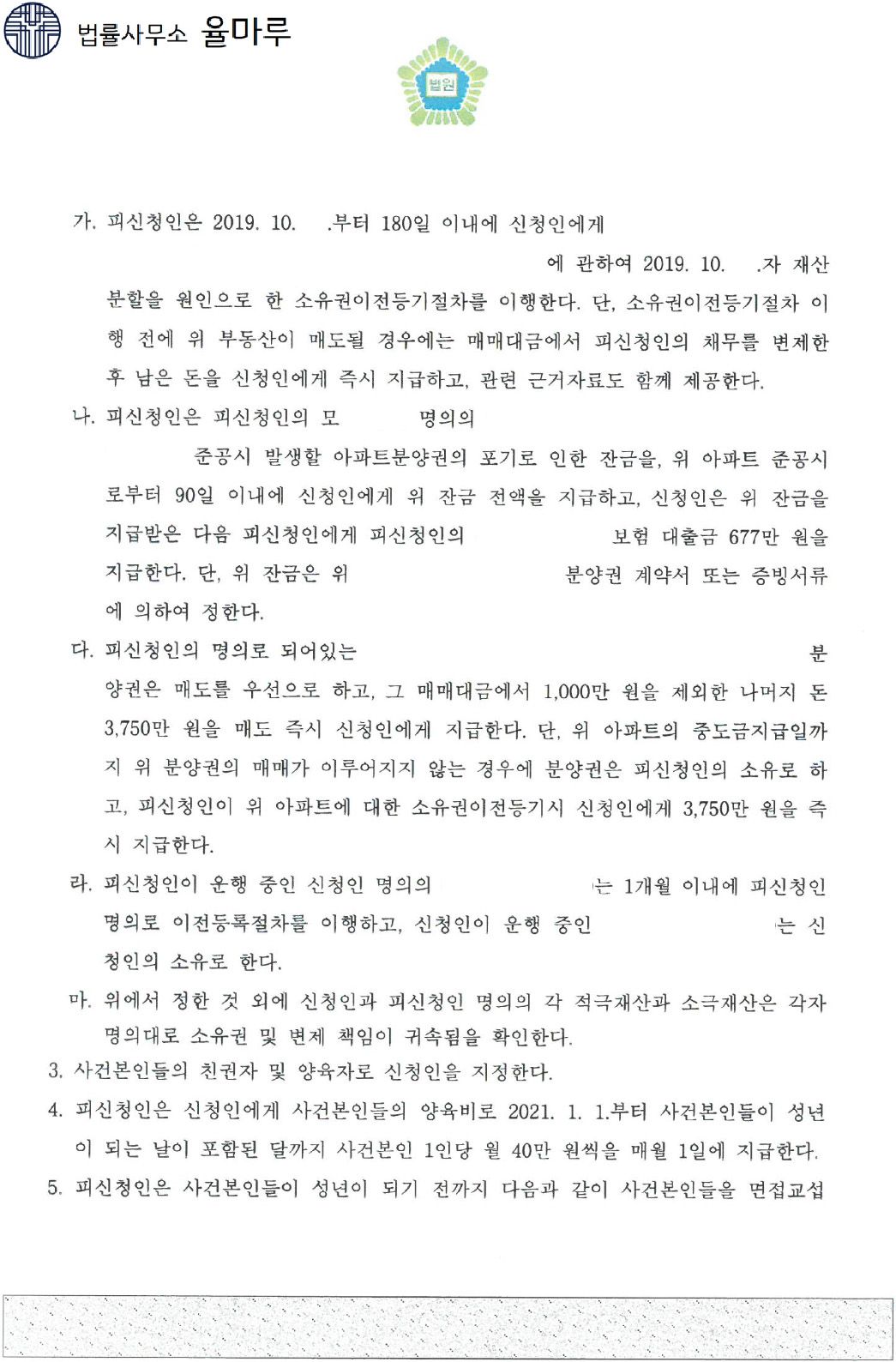 아울러 ① 양육비의 경우 한 자녀당 월 400,000원씩 받을 수 있도록 하였고, ② 재산분할의 경우 아파트 한 채는 의뢰인 소유로, 나머지 한 채와 분양권에 관하여는 매도한 다음 의뢰인에게 매매대금을 지급할 수 있도록 합의한바, 의뢰인이 원했던 내용으로 합의서를 제출할 수 있었습니다.
