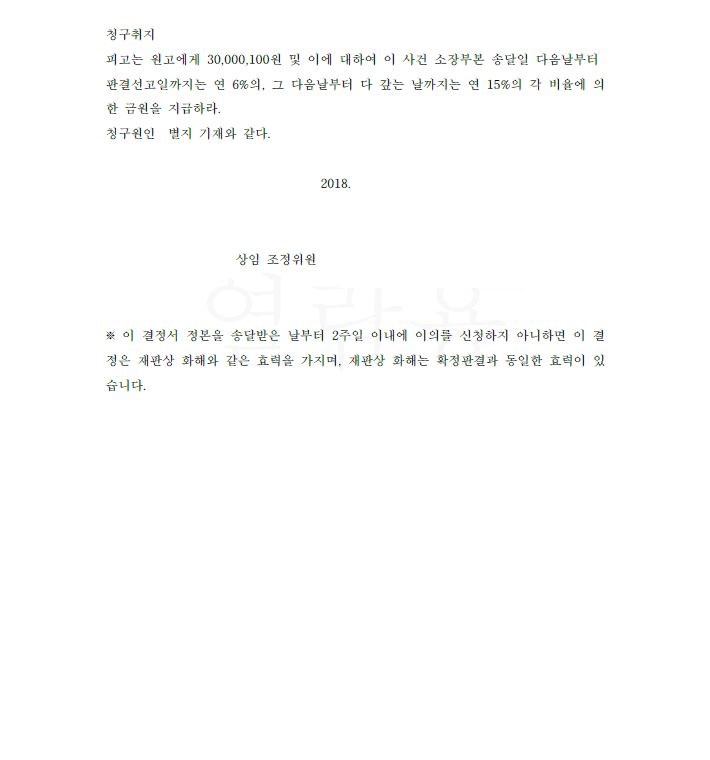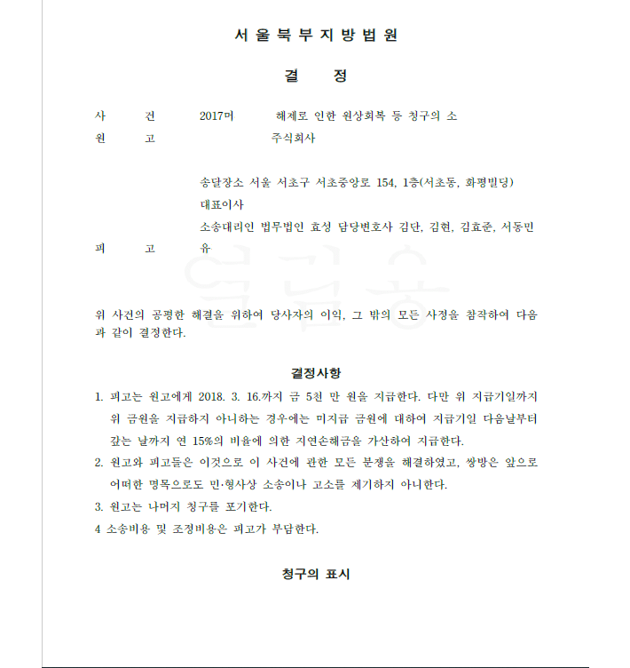 저는 의뢰를 받고 즉각 피고를 상대로 피고의 귀책에 기한 이행불능 계약 해제 및 지급한 대금의 원상회복과 손해배상을 청구하였습니다. 법원은 저희의 주장을 모두 받아들여 저희 청구액보다 많은 금액을 피고가 지급하라는 화해권고결정을 내렸고 확정되었습니다. 의뢰인은 원상회복과 손해배상 모두를 받아내었습니다.