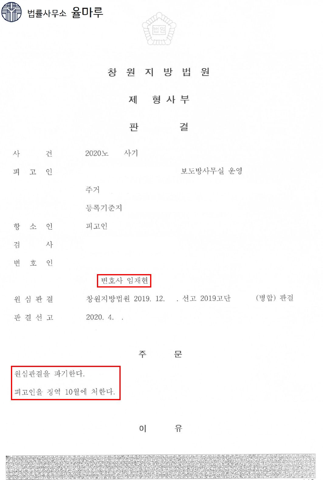 재판부에서는 본 변호인이 주장한 내용을 인정하여 ① ‘피고인이 취득한 이득금은 일부에 그치고 나머지는 피고인과 함께 피해자를 찾아간 OOO이(제3자) 취득한 것으로 보이며.’, ② ‘피해자도 일부 금원은 도박자금으로 사용된다는 사정을 알면서도 돈을 빌려준 점’이라고 판시하면서 원심 징역 1년을 파기하고 징역 10월을 선고하였습니다.