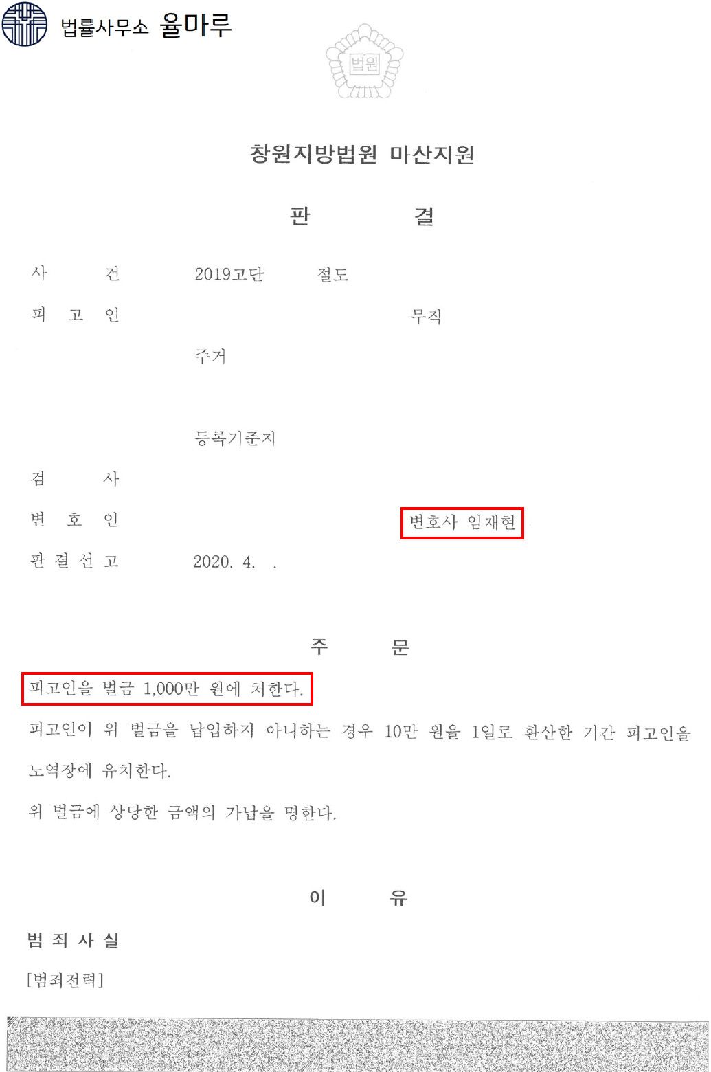 재판부에서는 마지막 공판기일까지 ‘피고인의 선처에 대해서는 의문이 든다.’고 말할 정도로 많은 고민을 한 다음 의뢰인에게 벌금형을 선고하였습니다. 이처럼 같은 사건이라도 변호인의 노력에 따라 결과가 달라질 수 있음을 보여준 의미있는 사건이었습니다.