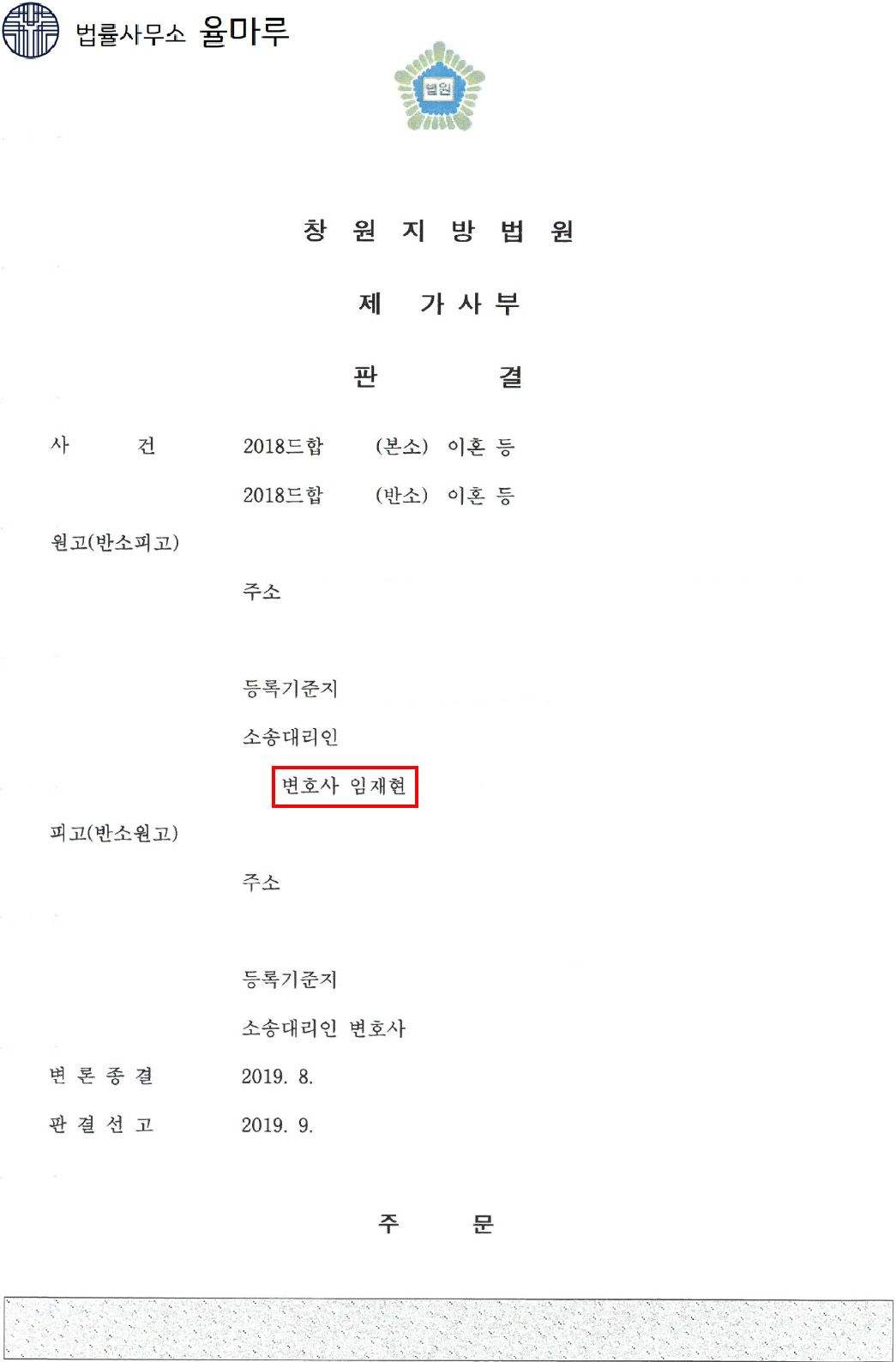 재판부는 상대방이 의뢰인에게 제기한 위자료 청구를 기각하였고, 상대방이 사용한 의뢰인 명의 카드채무 수억 원에 대하여 재산분할 대상임을 인정하면서 의뢰인은 상대방이 소유하고 있는 재산의 40%를 재산분할로 받을 수 있다고 하였습니다.