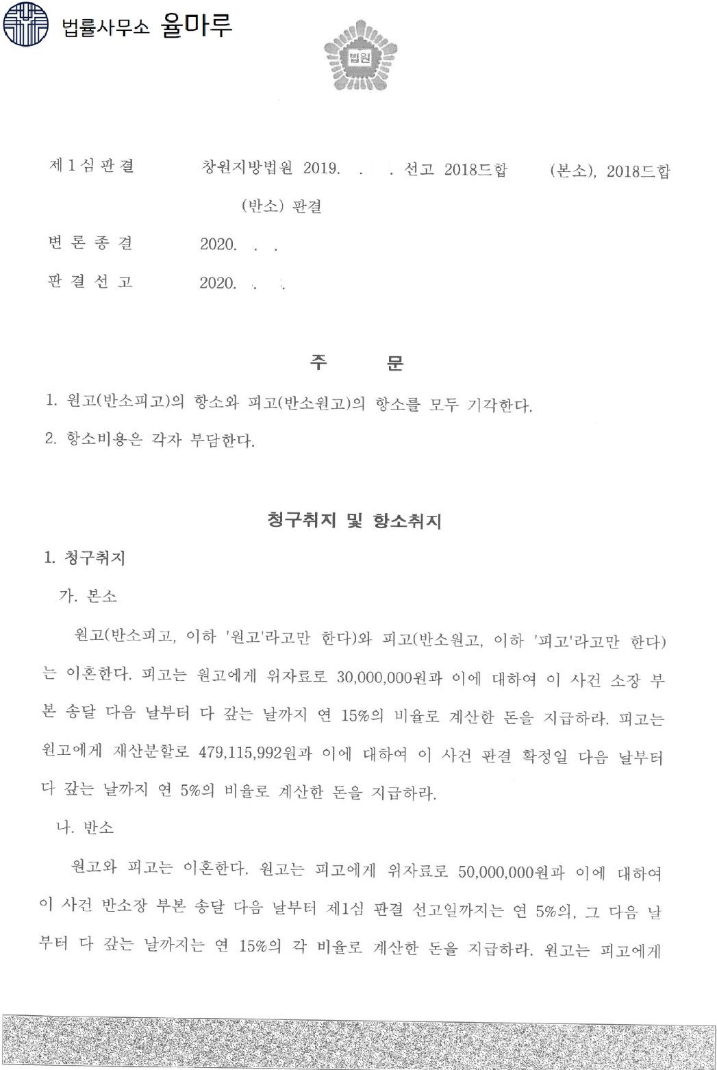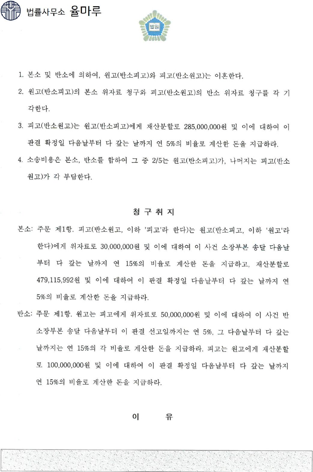 또한 본 사건의 경우 상대방이 의뢰인에게 소를 제기하여 위자료 5,000만 원과 재산분할로 1억 원을 청구한바, 이에 대한 방어도 함께 해야 하는 상황이었습니다.