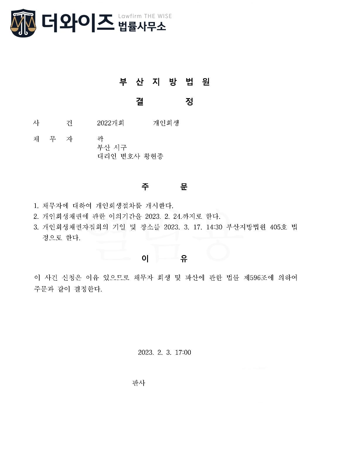 2023. 02. 03. 개인회생 개시결정