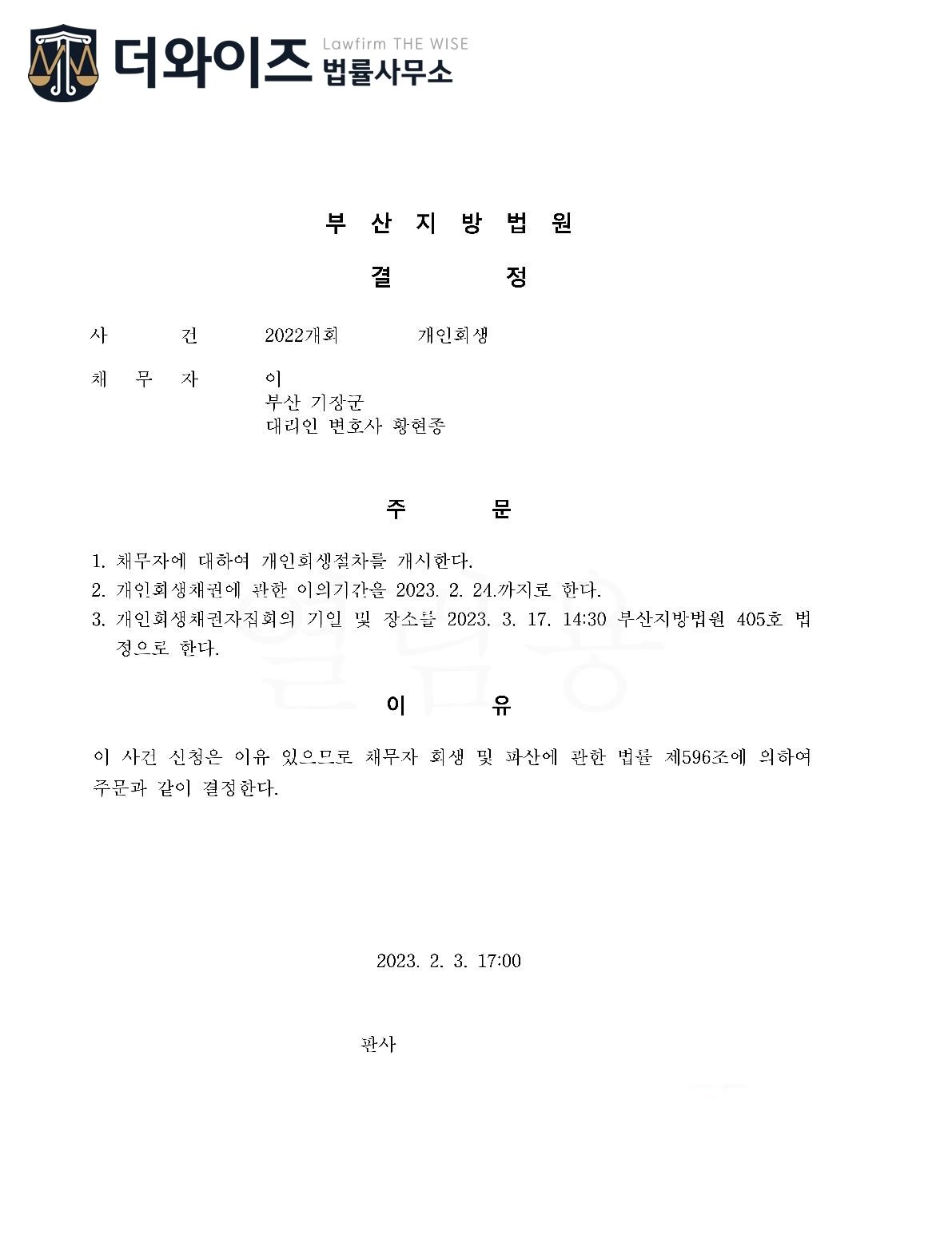 황변호사는 부산 기장군에 거주하는 의뢰인의 부산개인회생 사건을 담당하여 개인회생 신청 접수 후 2개월 만에 부산지방법원에서 개인회생 개실결정을 받았습니다.