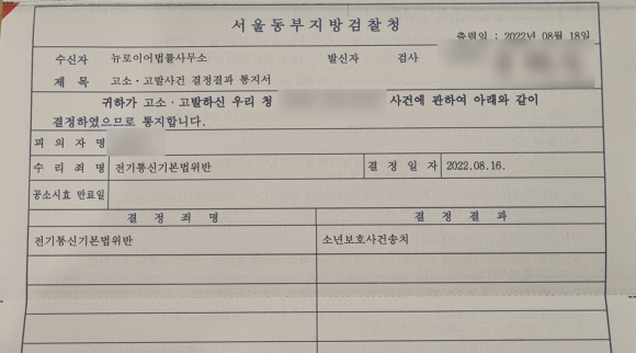 알고보니 상대방은 미성년자였고, 결국 소년보호사건으로 송치되었습니다.